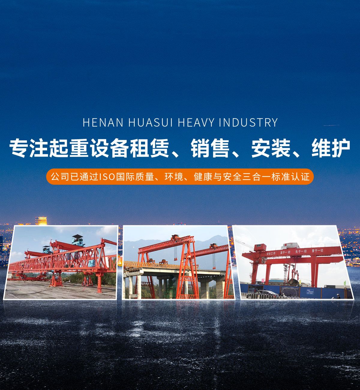 河南華隧重工機械裝備有限公司主要從事通用門式起重機、橋式起重機、電動單梁起重機,輪胎式起重機、架橋機、提梁機、遠梁平車、鋼絲繩電動萌蘆、卷揚機、起重配件制造、銷售:起重機械租賃、安裝和維修,起重設備園收,機械設備維修,鋼結構工程承包,橋梁工程及技術咨淘服務,銷售五金制品、機電設備:建設工程監理,建設工程設計,各類工程建設活動,建筑勞務分包,建筑物折除作業,施工作業,工程管理服務,土石方工程施工,裝如發運。  公司已通過IS0國際質量、環境、健康與安全三合一標準認證,特種設備制造許可證和特種設備安裝改造維修許可證。擁有完熟的質量管理體系。嚴格的管理制度,強大的生產能力和先進的檢測手段,在保證產品質量的同時,也具備了極強的市場競爭力?! 」緢猿挚萍紕撔聻槔砟睿a品質量為核心,注重信譽,建立了減信可靠、快捷、思速。便利周到的售后服務網絡?! ∥覀儞碛械募夹g專家和技術服務隊伍為客戶提供充善的售前技術支持和全天候的售后服務體系,讓您無后顧之憂,享受一站式的超值服務?!  叭A隧重工,伴您成功“是華隧重工永遠的宗指,真被的希望與各界朋友攜手并進。共創輝準!